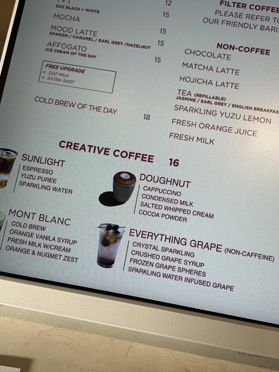 Non-coffee options include specialty tea beverages like the Hojicha Latte, a creamy roasted green tea beverage known for its warm and nutty flavor.